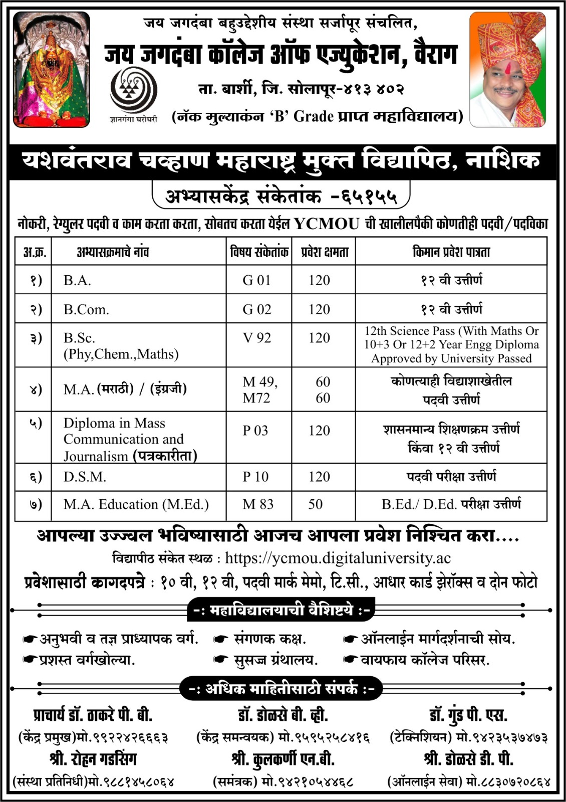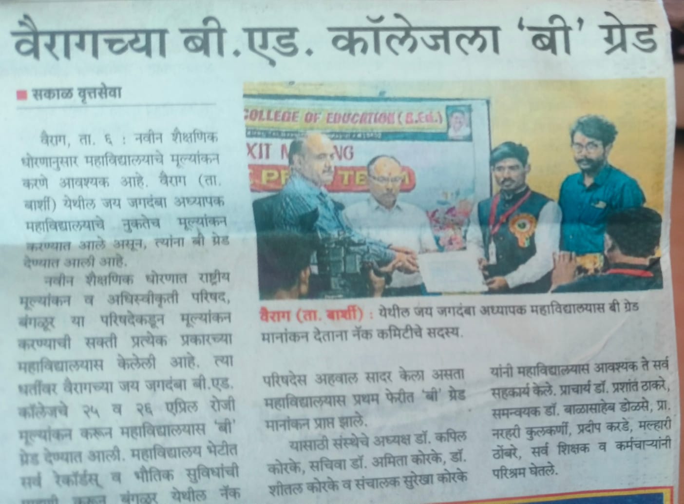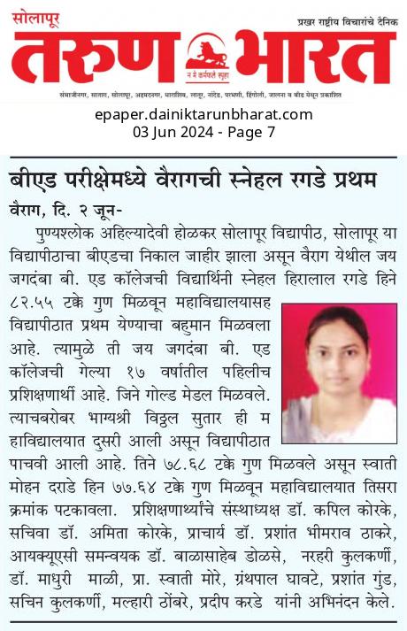 Jay Jagdamba B.Ed & M.Ed College in Vairag,Solapur , Started its first acadamic session of imparting comprehensive education to the aspirants in 2005-2006. The college is affiliated to Jay Jagdamba B.Ed & M.Ed college Vairag(Solapur University,Solapur) & has gained the recognition from National Council for Teacher Education (NCTE) Bhopal. Working Under the guidance &Sponsorship of Jay Jagdamba Bahuddeshiya Sanstha,the educational institution conducts two years of full-time undergraduate degree level Bachelor of Education (B. Ed) & (M.Ed) course in Marathi medium. Since its inception, Jay Jagdamba B. Ed & M.Ed College is dedicated to the cause of producing proficient teachers. The autonomous educational institution offers modern amenities and conducts seminars on a regular basis.